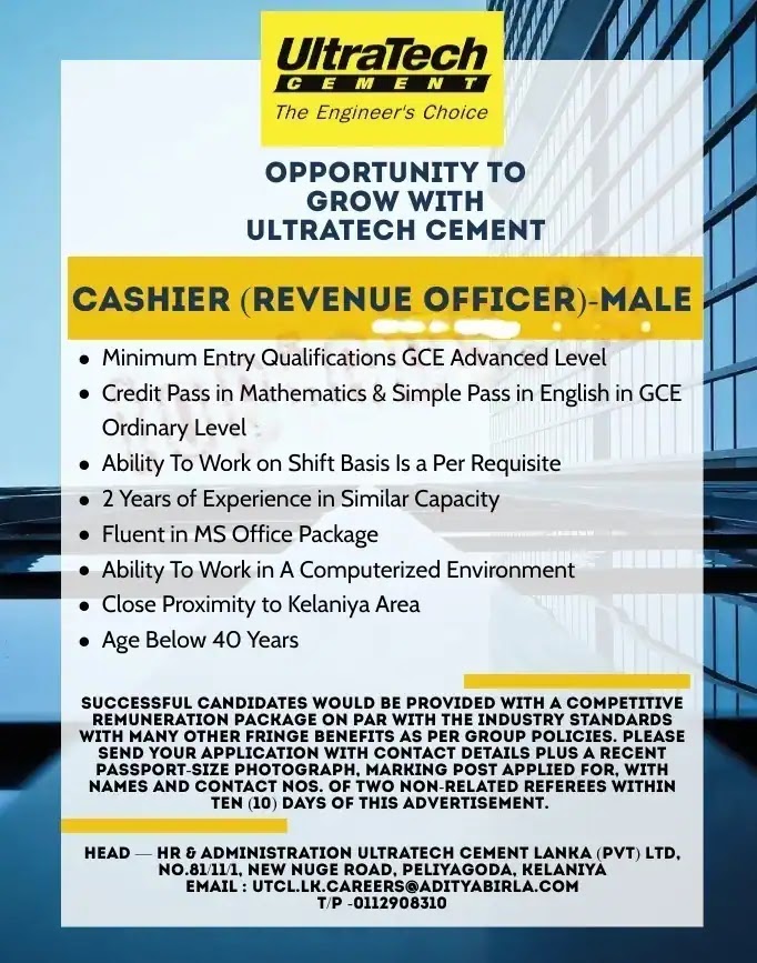 Post of Cashier (Revenue Officer) -UltraTech Cement Lanka (Pvt) Ltd