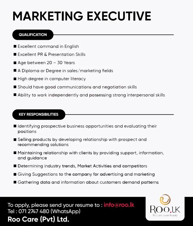 Post of Marketing Executive – Roo Care (Pvt) Ltd.