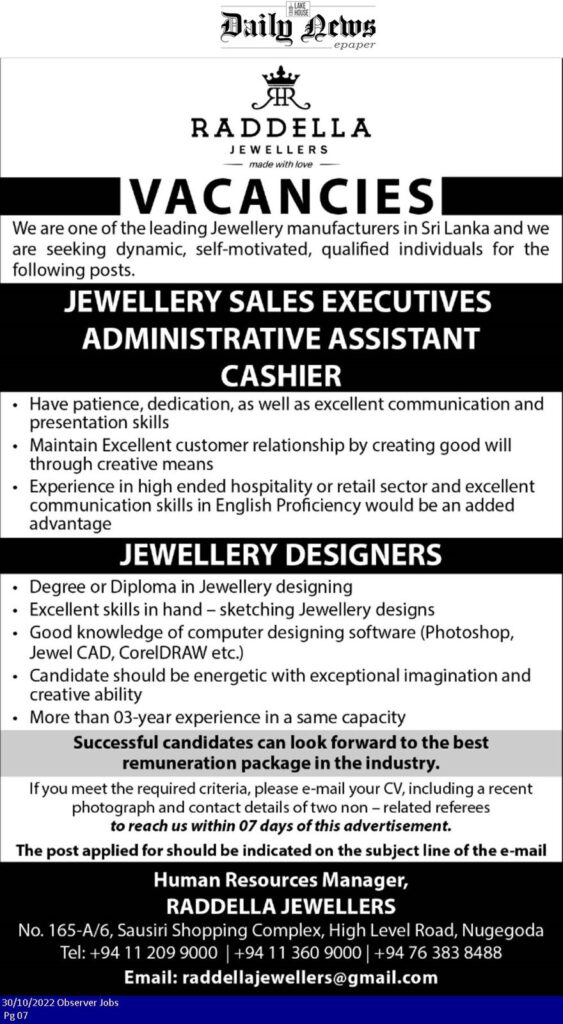 Raddella Jewellers – Cashier, Jewellery Sales Executives, Administrative Assistant, Jewellery Designers Vacancies 2022