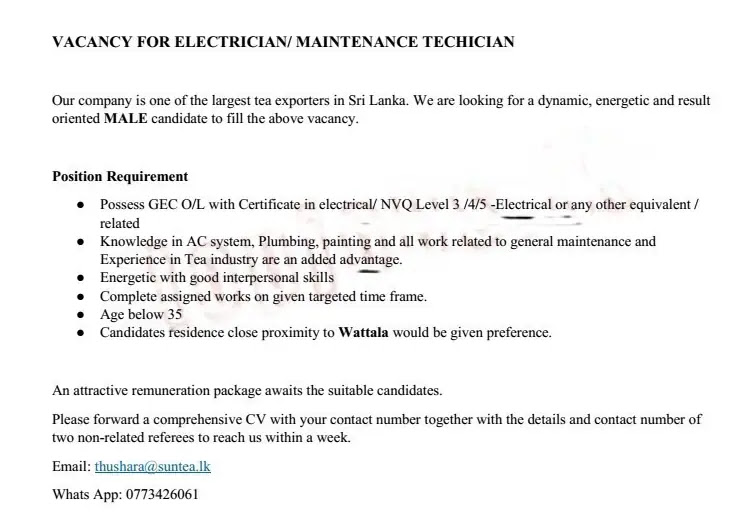 Vacancy for Electrician / Maintenance Technician- Sun Tea Company