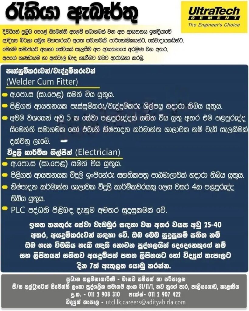 Vacancy for Welder Cum Fitter, Electrician- UltraTech Cement Lanka (Pvt) Ltd